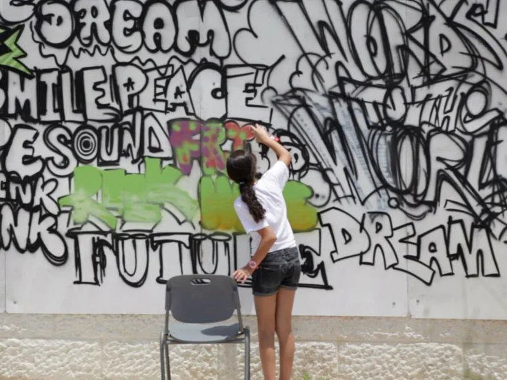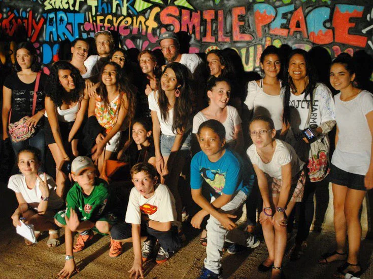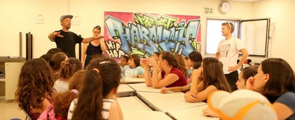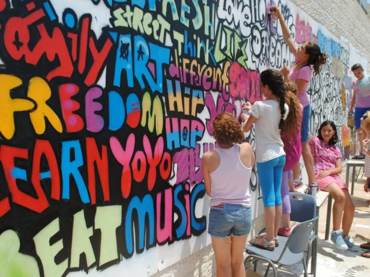 In July of 2012, ARTS By The People sent two of our teaching artists, Brad “Bisco” Smith and Gustav Gauntlett, to Jerusalem, Israel to run a hip hop songwriting and street art workshop with Arab and Jewish middle-school students. The workshop included a group of 52 students between the ages of 9 and 14 years old. They learned about the techniques and history of socially conscious street art and designed and completed their own 32’ x 8’ mural.