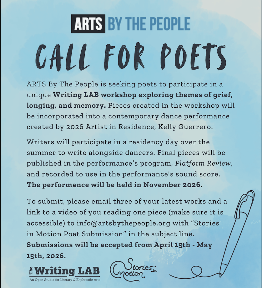 To submit, email 3 of your latest works and a link to a video of you reading one piece to info@artsbythepeople.org (make sure the link is accessible)